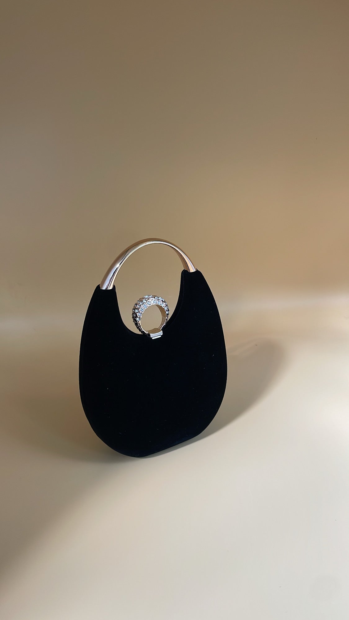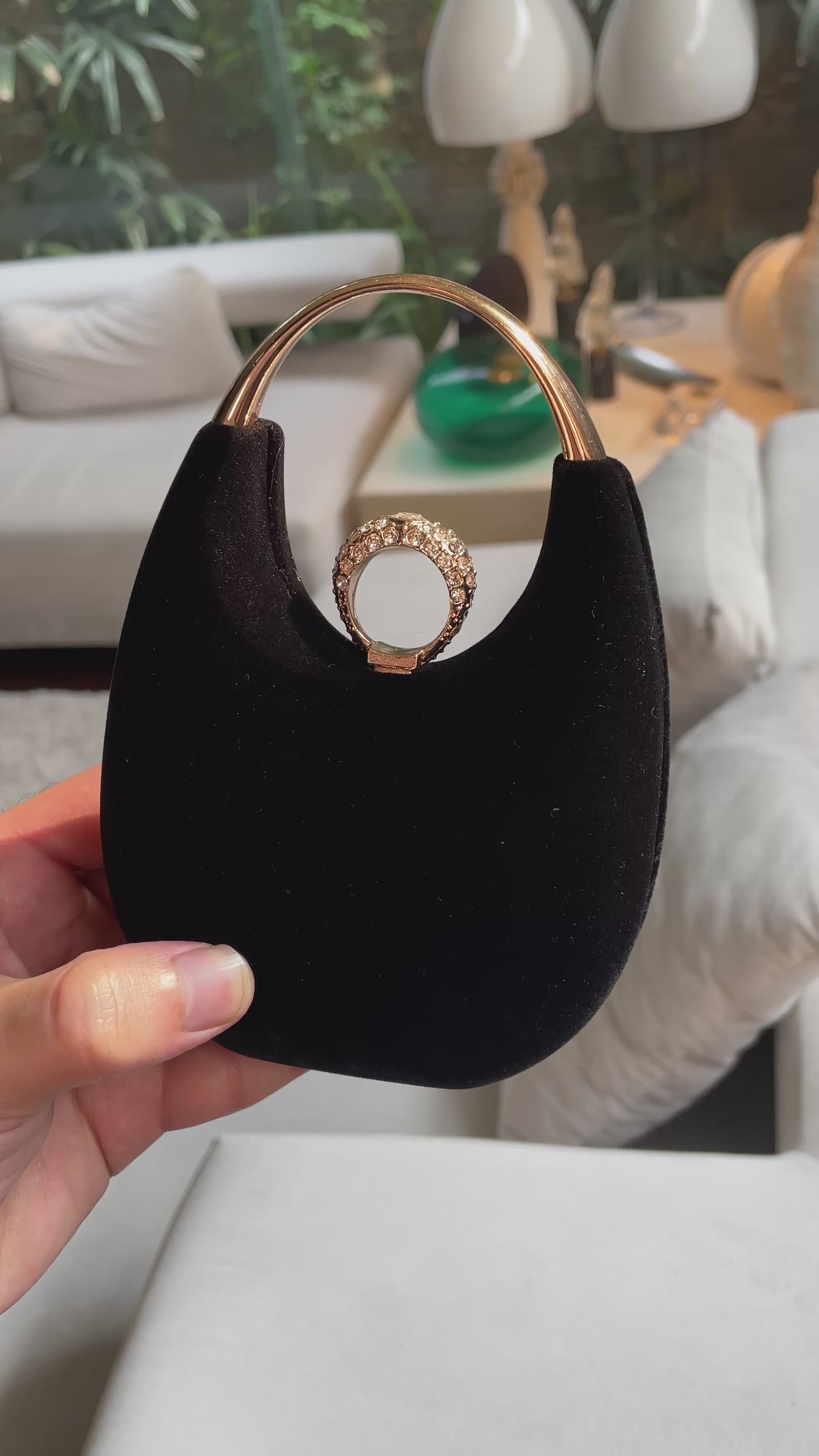 A sleek and elegant black velvet evening bag designed with a chic gold handle and pearl clasp closure. Its minimalist silhouette makes it perfect for dinners, parties, or formal events. Compact yet stylish, this bag is the ultimate statement accessory to elevate any outfit.