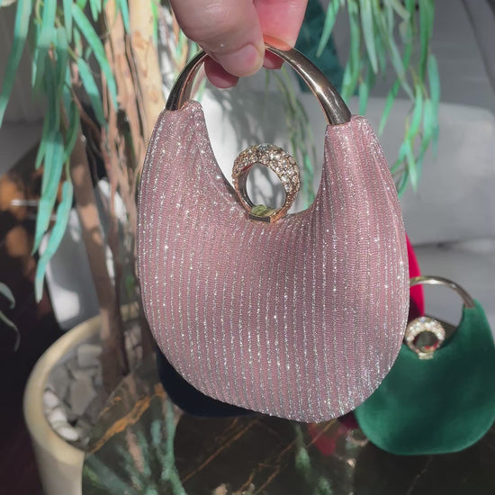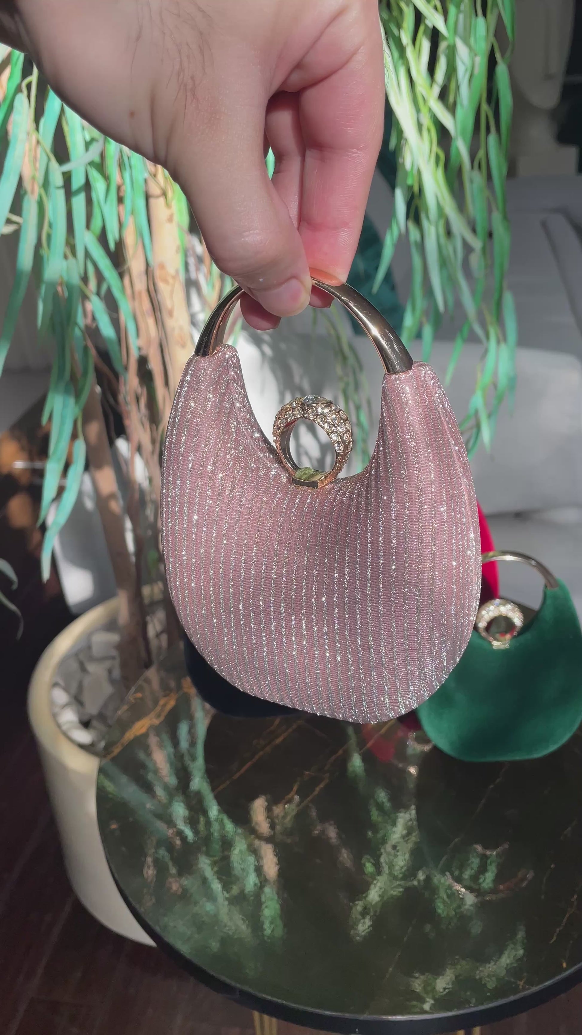 - Elegant metallic top handle with a crystal-studded ring accent.