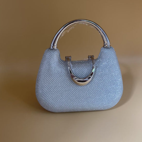 Shimmer in style with this silver metallic clutch, designed with a luxe handle and sparkling finish to elevate any outfit.