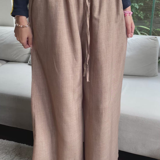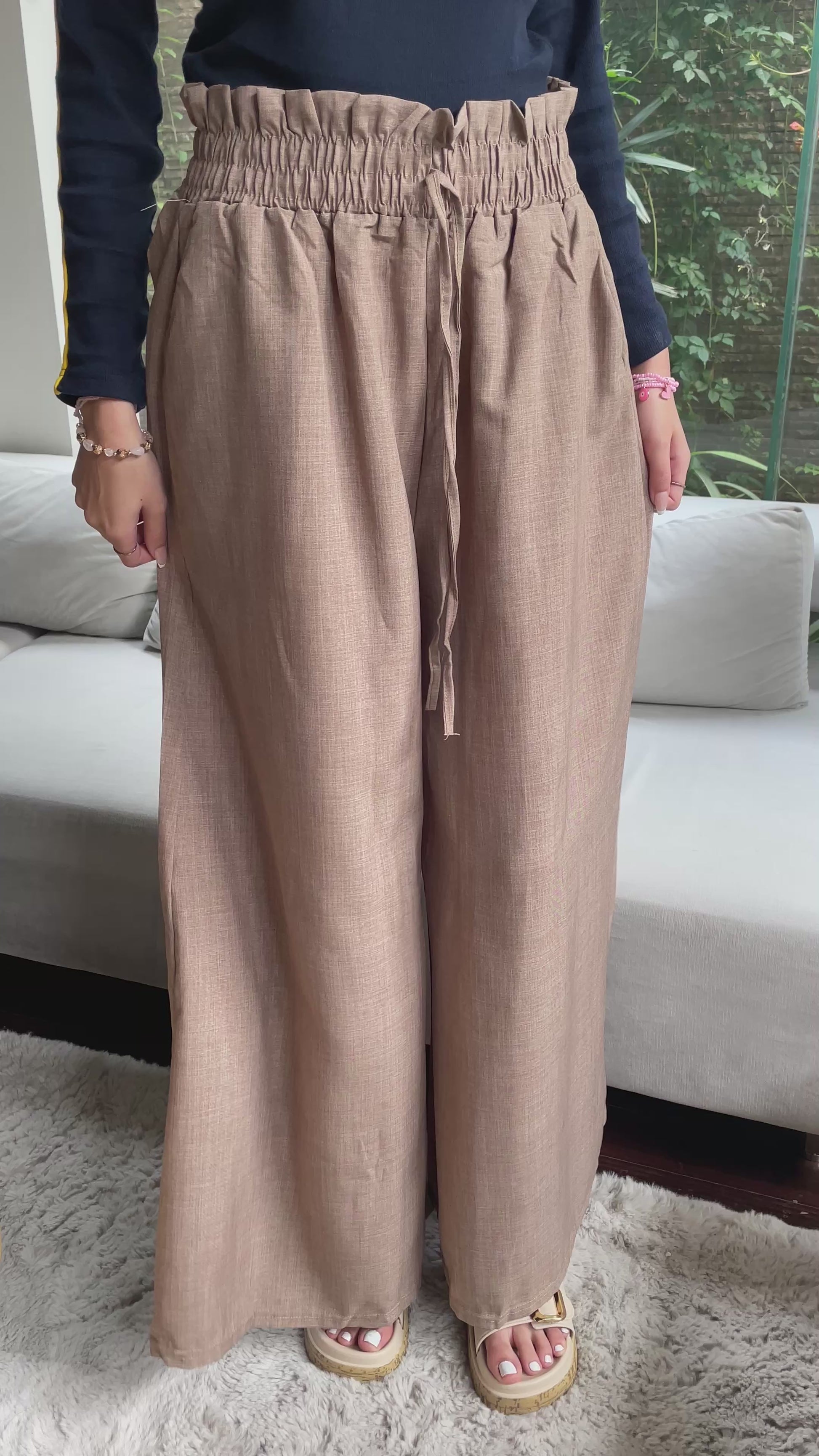 These mocha-toned wide-leg paperbag pants are the perfect blend of comfort and style. With a high-rise elastic waistband and flowy relaxed fit, they’re versatile enough for casual days or dressed-up evenings. Pair them with a fitted top or loose blouse for an effortlessly chic look.