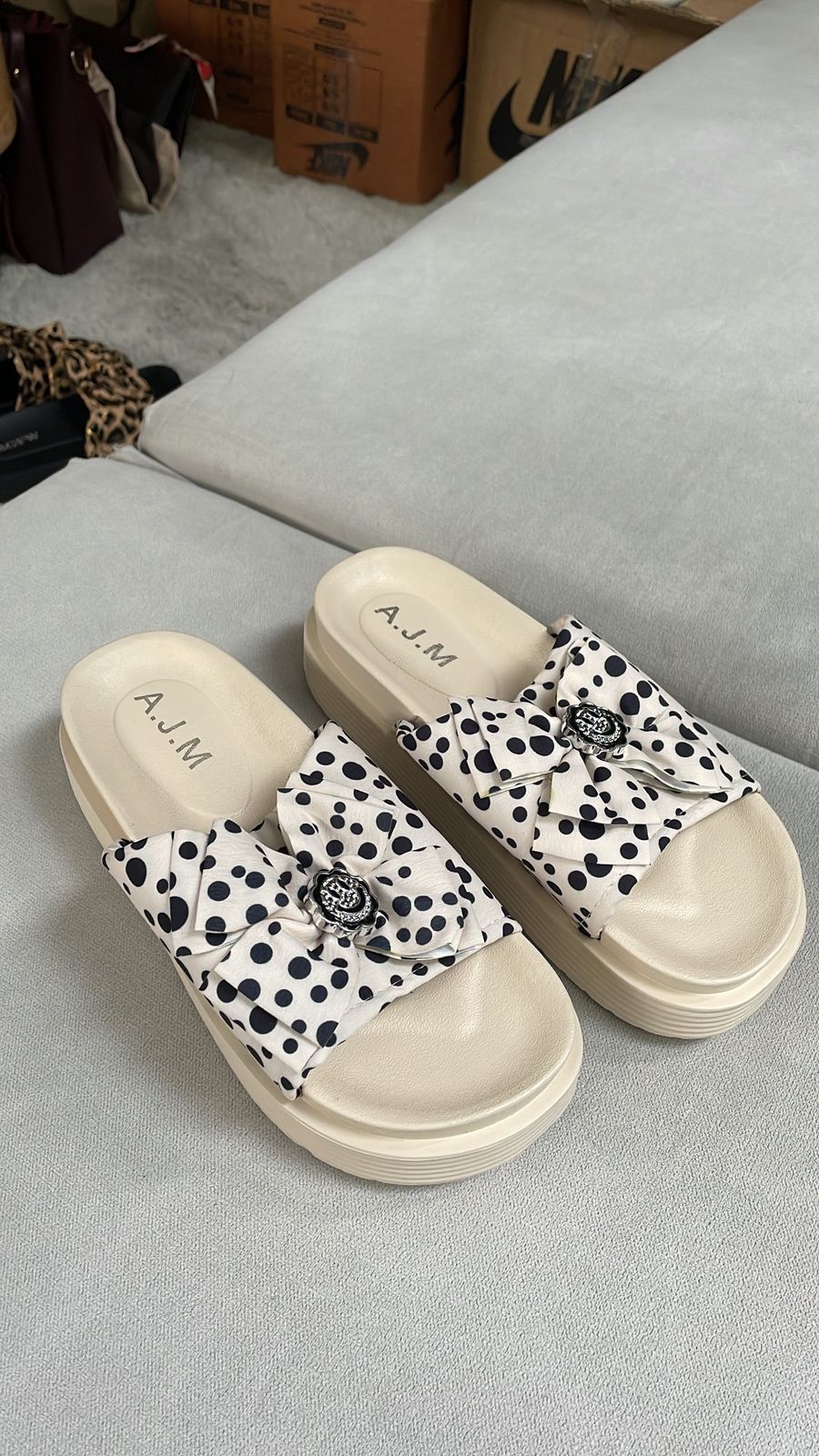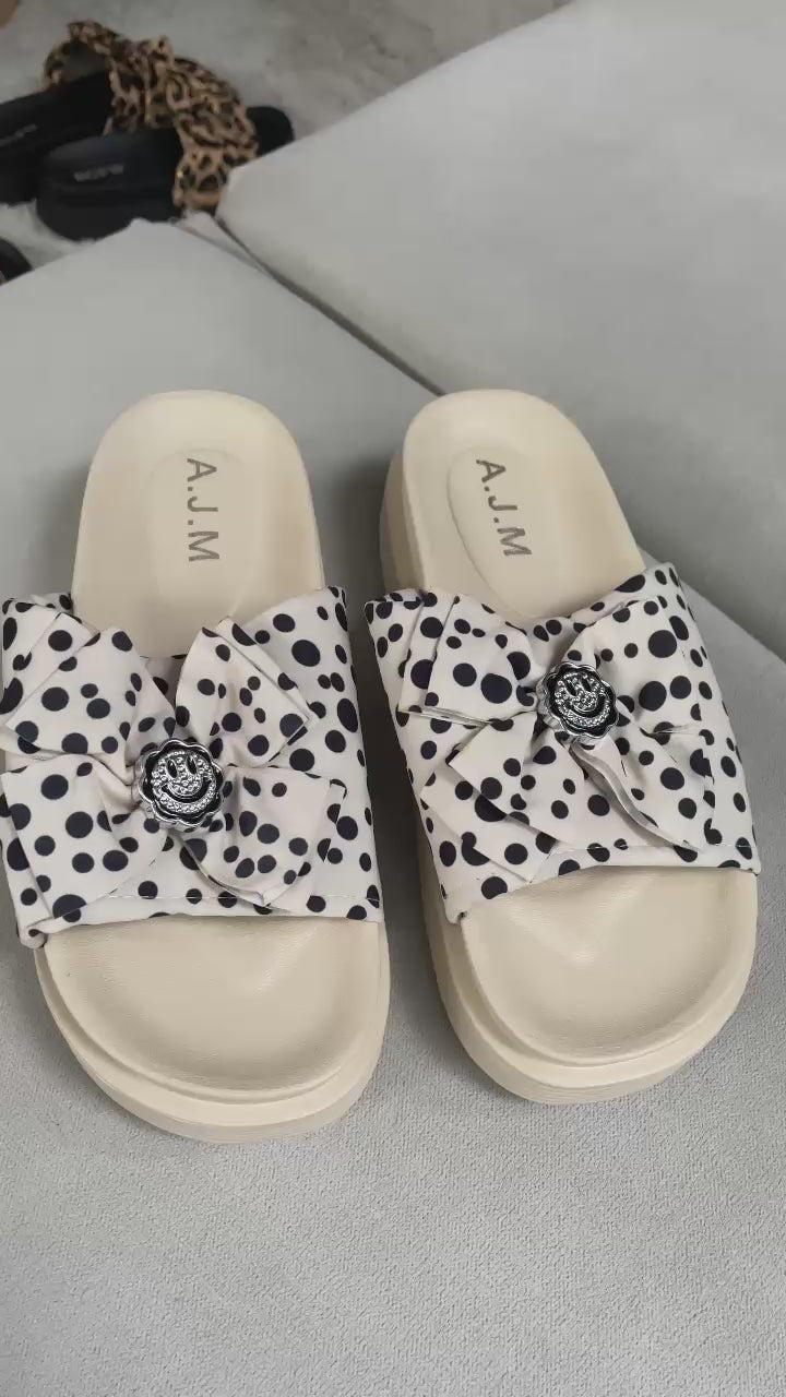 Embrace playful elegance with Polka Bloom, where timeless polka dots meet charming bows for a look that’s both classic and fresh. Featuring a soft off-white base dotted with bold black spots and finished with a statement bow adorned by a chic emblem, these slides are made to stand out.