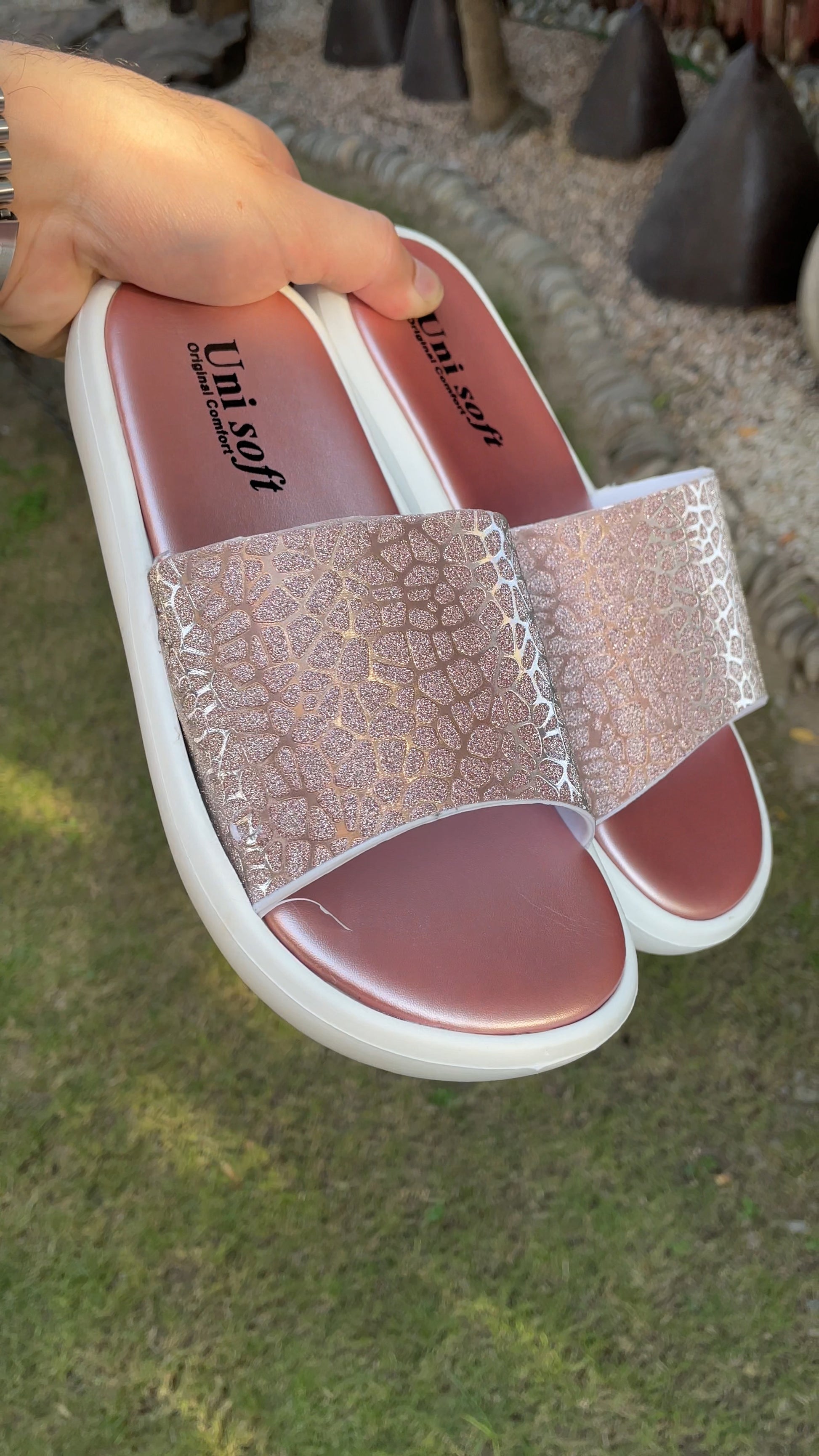 Step into effortless comfort and style with these Rose Gold Comfort Slides. Designed with a glittery crocodile-textured strap and a soft cushioned footbed, these slides are perfect for everyday wear. The lightweight design with a sturdy white sole ensures maximum comfort whether you’re at home, running errands, or out with friends.