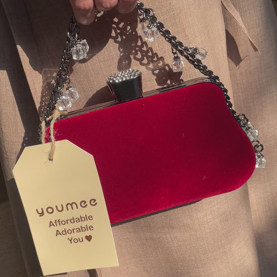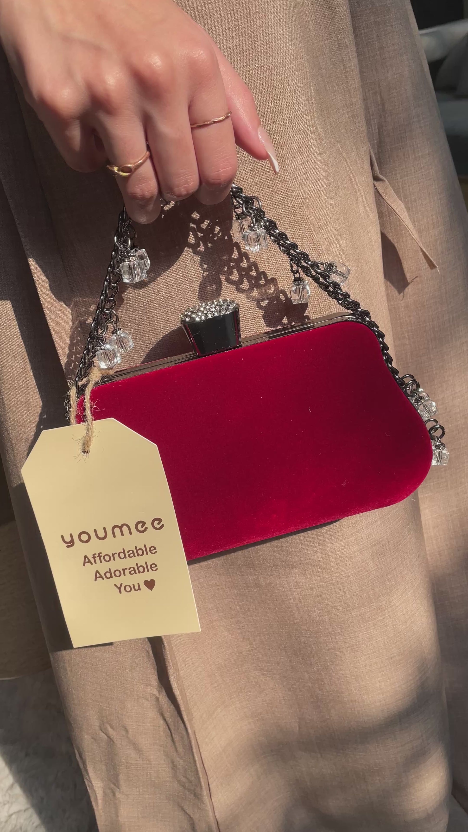 Bold, radiant, and irresistibly elegant, the Ruby Allure Bag is designed to turn every glance into admiration. Wrapped in plush red velvet, it features a crystal-studded clasp and cascading chain accents adorned with sparkling charms, capturing the essence of timeless luxury.