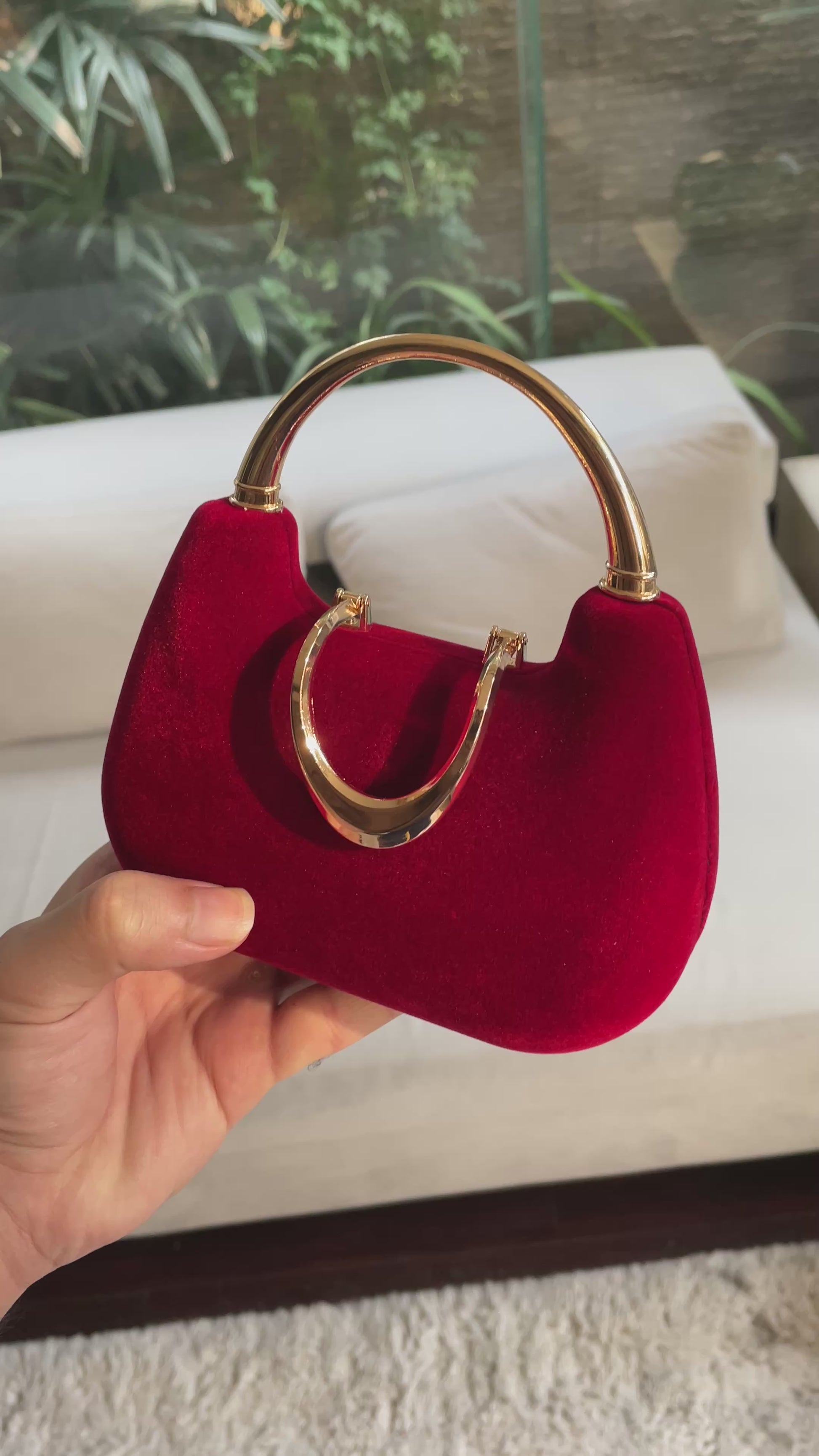 Velvet Elegance Clutch – Crimson Red with Champagne Gold Handle